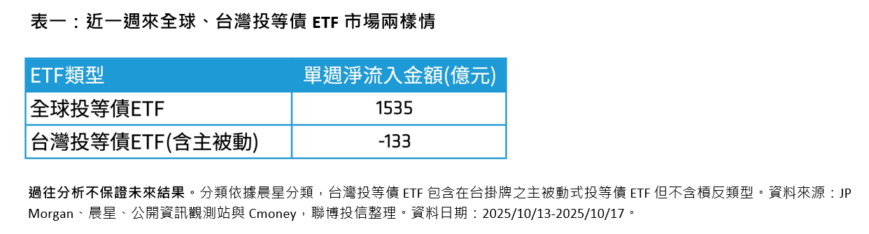 在這樣的市況下,具備品質與相對殖利率優勢的投資等級債券格外受全球投資人青睞。截至上週五(10月17日)的一週全球ETF市場,投資等級債ETF呈現淨流入約50億美元(約1535億元新台幣)。反觀台灣投資等級債ETF市場,卻是淨流出約133億元新台幣(表一)。