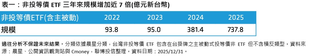 台灣投資人有多偏愛非投資等級債券ETF?觀察台灣近三年來非投資等級債券ETF(含主被動ETF)的資金變化,成長幅度相當可觀。截至去年底的數字顯示,非投資等級債券ETF三年資產規模,從2022年的93.8億元新台幣,成長至2025年的737.8億元新台幣,漲幅近7倍(表一)。