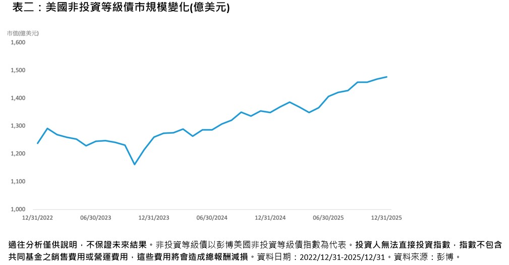 這現象不只發生在台灣,觀察美國非投資等級債市近三年的規模變化,近三年成長238億美元,19% (表二),2025年規模則成長108億美元,7%。顯示不管台灣或美國,非投資等級債是近年熱門投資標的之一。隨著今年(2026)預估在聯準會持續降息的環境下,資金可望持續湧入非投資等級債,後市值得投資人長期布局。