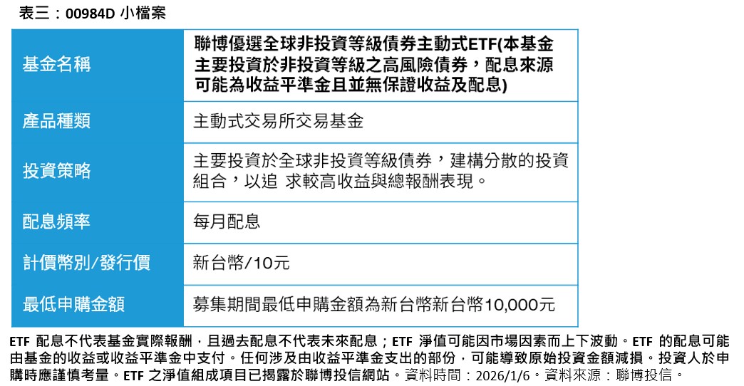鍾郁婕表示,00984D以違約率相對較低的 BB 與 B 級債券為核心,搭配投資團隊精選少數具潛力的CCC級企業債,涵蓋各天期及信評,多元產業,有效分散風險,追求提升收益機會。00984D即將於1月12日至16日展開募集,主要聚焦全球已開發國家非投資等級企業債,每股發行價格定為新台幣10元,並採每月配息機制。在今年非投資等級債市可望迎來利多的環境下,投資人或可視自身風險屬性適當布局。