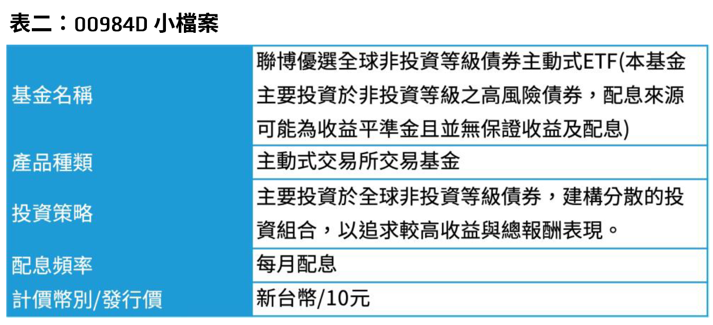 聯博投信旗下首檔主動式非投資等級債券ETF—00984D聯博優選全球非投資等級債券主動式ETF (本基金主要投資於非投資等級之高風險債券,配息來源可能為收益平準金且並無保證收益及配息) 由聯博債券投資團隊2主動選債,主要聚焦全球已開發國家非投資等級企業債,彈性配置各信評非投資等級債券,並分散配置消費、金融、能源等多元產業3。聯博00984D已於1月12日展開募集,1月16日募集結束,每股發行價格定為新台幣10元,並採每月配息機制。